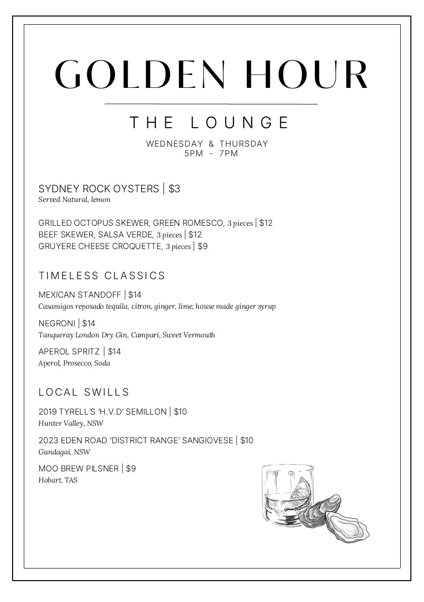 Lounge with $14 cocktails – Negroni, Aperol Spritz, and Mexican Standoff, $10 wine by the glass, $9 craft beers, perfectly grilled skewers and the iconic $3 Sydney Rock Oysters.